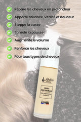 Chébé-Öl, Avocadoöl, Jojobaöl, Schwarzkümmelöl, Wüsten-Dattelöl, Aloe-Vera-Gel, Rosmarinwasser, Hyaluronsäure, Provitamin B5, Maca, Reis- und Seidenprotein, Bio-Duft und Vitamin E.