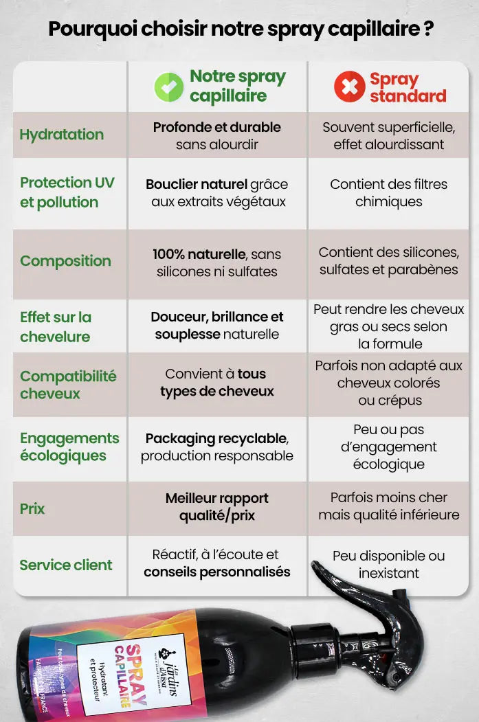 This organic and natural hair spray isthe perfect ally for healthy hair. Designed to meet the needs ofcurly, frizzy, locked, kinky, transitioning (nappy) hair and evenstraight hair, this leave-in treatment is ideal tohydrate, protect, and beautify your hair while caring for your scalp.Perfectlysuitable for pregnant women and children