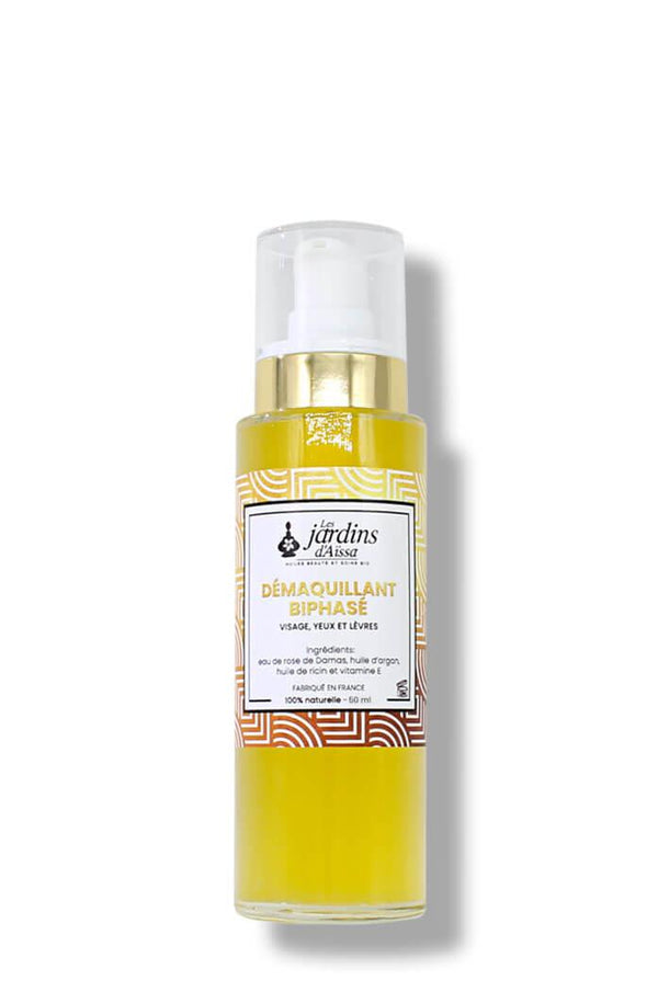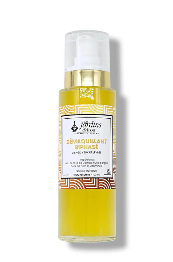 Soin démaquillant biphasé pour visage, yeux et lèvres 100% Bio - 100 ml - lesjardinsdaissa.com flaconSoin démaquillant biphasé pour visage, yeux et lèvres 100% Bio - 100 ml - lesjardinsdaissa.com bienfaits